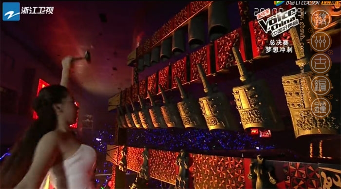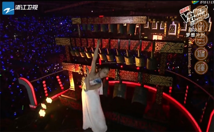 2014年10月7日,中國好聲音第三季北京總決賽在北京首都體育館成功舉辦,開場(chǎng)時(shí)一位身穿白衣的美麗女孩敲擊編鐘發(fā)出美妙的好聲音,這套編鐘就是由隨州市古編鐘文化發(fā)展有限公司制作的22件曾侯乙編鐘。
